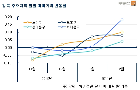 주요 강북지역에 따라 살펴보면 상승폭이 높진 않지만 지난해 말부터 '슬금' 오르고 있다는 공통점이 있다. 3일 부동산정보업체 부동산 114에 따르면, 2010년 11월부터 올해 2월까지 강북지역 매매가 누적변동률은 ▲노원구 0.2% ▲도봉구 0.14% ▲동대문구 0.09% ▲서대문구 0.28%를 기록했다. 이중 동대문구의 경우는 2010년 11월부터 올해 1월까지 3개월 동안 매매가가 연속 하락하다가 상승 반전돼 눈길을 끈다.
