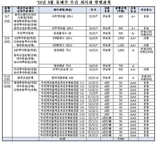 금융투자협회가 4일 발표한 ‘3월 둘째주(3월7일~11일) 회사채 발행계획 집계 결과’에 따르면 NH투자증권과 산업은행, 대우증권, 하나대투증권이 공동주관하는 한진해운 70회차 2500억원을 비롯하여 총 25건 7748억원의 회사채가 발행될 예정이다. 이는 이번주(2월28일~3월4일) 발행계획 23건 2조6816억원에 비해 발행건수는 2건이 증가한 반면, 발행금액은 1조9068억원 감소한 것이다.