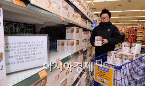[아시아경제 이재문 기자] 국립수의과학검역원이 시중에 유통중인 조제분유에 대한 정기 검사 결과 매일유업에서 생산한 유아용 조제분유 ‘앱솔루트 프리미엄명작 플러스-2’에서 식중독을 일으키는 황색포도상구균이 검출됐다고 밝힌 가운데 4일 서울 한 대형마트에서 직원들이 앱솔루트 프리미엄명작 플러스-2를 긴급 회수하고 있다.