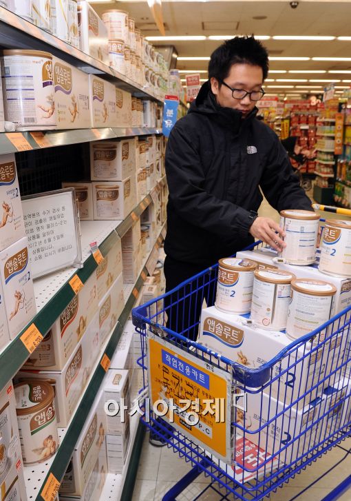 [아시아경제 이재문 기자] 국립수의과학검역원이 시중에 유통중인 조제분유에 대한 정기 검사 결과 매일유업에서 생산한 유아용 조제분유 ‘앱솔루트 프리미엄명작 플러스-2’에서 식중독을 일으키는 황색포도상구균이 검출됐다고 밝힌 가운데 4일 서울 한 대형마트에서 직원들이 앱솔루트 프리미엄명작 플러스-2를 긴급 회수하고 있다.
