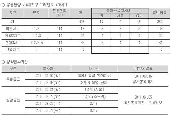 분양가는 마천지구(5억2642만~5억9530만원), 강일2지구(5억1238만~5억8461만원), 신정3지구(4억3535만~4억8903만원), 천왕지구(4억3603만~4억7065만원)이다.