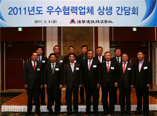 한라건설은 지난해 우수한 평가를 받은 외주부문 54개사와 자재부문 25개사를 합한 총 79개사와 함께 지난 4일 잠실 롯데호텔에서 '2011년 우수협력업체 상생 간담회'를 실시했다고 8일 밝혔다.