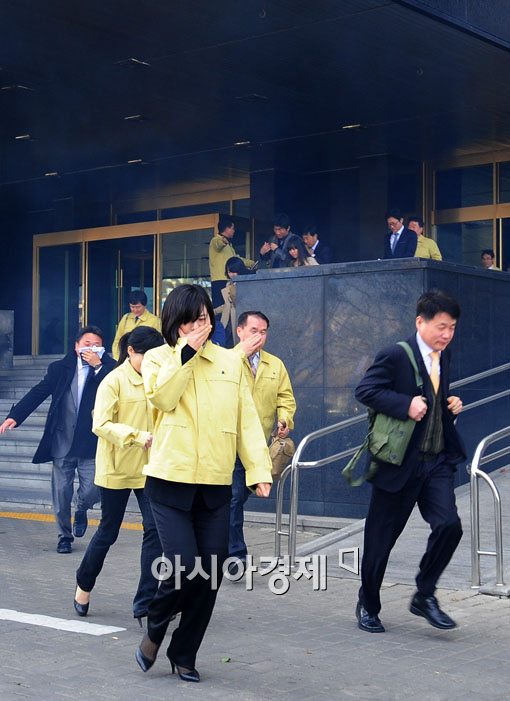 [아시아경제 윤동주 기자] 민방위 날을 맞아 15일 서울 세종로 정부종합청사에서 열린 '재난대비 긴급구조 종합훈련'에서 공무원들이 중요 문서등을 들고 청사를 탈출하고 있다.