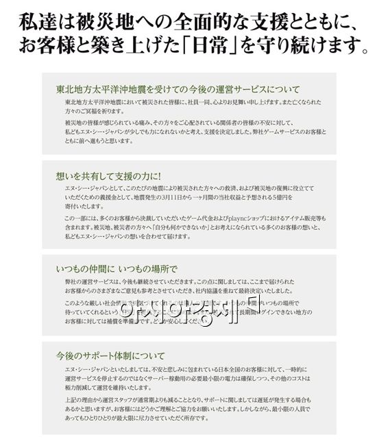 엔씨재팬은 이번 지진으로 피해를 입으신 분들께, 직접적인 지원 및 피해 지역의 복구에 힘이 될 수 있도록 지진 발생일인 3월 11일부터 1개월 간의 당사 매출로 예상되는 약 5억엔(약 70억 원)을 기부하기로 결정하였습니다.