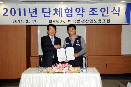 발전 5사 대표인 중부발전 남인석사장과 한국발전산업노동조합 박종옥 위원장은 17일 단체협약을 체결했다. 이는 발전회사와 노조가 2008년 7월 29일 단체교섭을 시작 후 2년 7개월간 총 46회의 교섭을 통하여 얻어낸 결실이다.