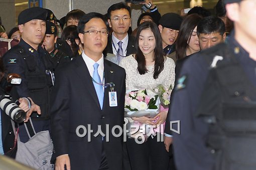 [인천공항=스포츠투데이 이기범 기자]일본 지진으로 인해 '2011 ISU 세계피겨스케이팅 선수권대회'가 무기한 연기된 가운데 '피겨 여왕' 김연아가 20일 오후 인천국제공항을 통해 귀국한 뒤 기자회견장으로 향하고 있다.