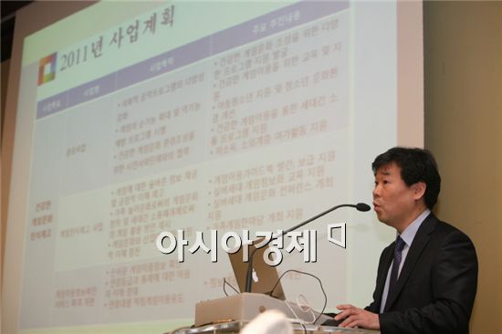 [스포츠투데이 강경록 기자]게임문화재단 정용환 사무국장이 21일 서울 중구 플라자호텔에서 열린 '게임과몰입 상담치료센터 설치, 운영에 관한 기자간담회에서 게임문화재단 사업계획을 발표하고 있다.