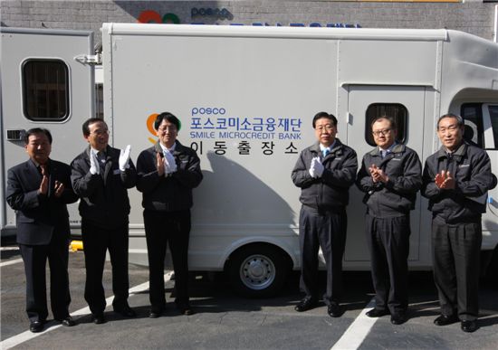 포스코는 23일 이날 포항시 북구 죽도시장내 미소금융재단 포항지점에서 정준양 회장 등 관계자들이 참석한 가운데 ‘미소금융 이동출장소’ 출범식을 가졌다.