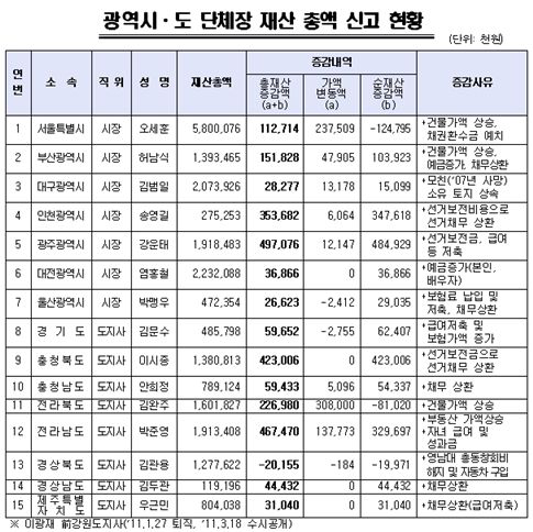[2011재산공개]광역시·도 단체장, 15명 중 14명 재산 증가