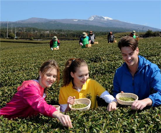 제주는 중국의 황산, 일본의 후지산과 더불어 세계 3대 녹차 생산지로 손꼽힌다. 이날 다원을 찾은 외국인 관광객들은 채엽전문가들의 도움을 받아 햇 녹차 잎을 직접 따보고 햇차를 시음하며 즐거운 한때를 보냈다.