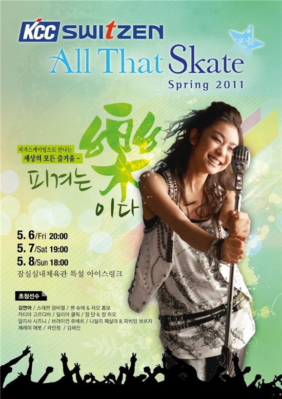 ‘KCC스위첸 올댓스케이트 스프링 2011’은 오는 5월 6일 오후 8시 공연을 시작으로 7일 오후 7시, 8일 오후 6시 공연 등 3일에 걸쳐 총 3차례의 공연이 진행될 예정이다.