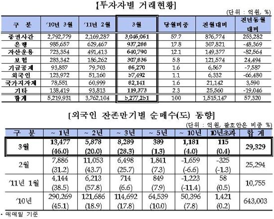 [아시아경제 김남현 기자] 3월 장외채권거래량이 사상최대치를 경신했다. 전체 채권발행물량도 전월비 30%가 증가하는 모습을 보였다. 외국인은 1년미만 단기물에 대한 순매수를 늘리며 소폭 늘어난 것으로 나타났다.