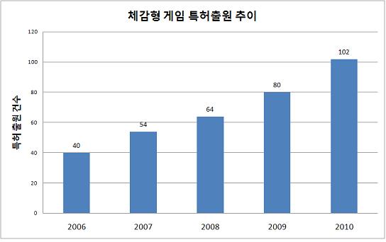 8일 특허청에 따르면 우리나라의 ‘체감형 게임’기술의 특허출원은 2006년 40건에 그쳤으나 지난해는 102건으로 크게 불었다. 2007년엔 54건, 2008년 64건, 2009건은 80건으로 꾸준히 늘어났다.
