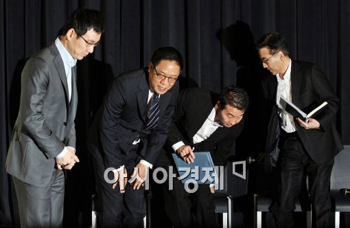 [아시아경제 이재문 기자]정태영(왼쪽 두번째) 현대캐피탈 사장이 10일 오후 서울 영등포구 여의도동 현대캐피탈 본사에서 해킹 관련 기자회견을 마친 뒤 인사를 하고 있다.