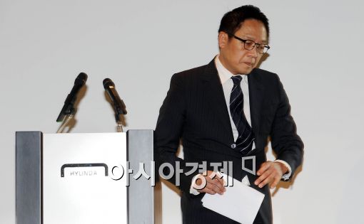 [아시아경제 이재문 기자]정태영 현대캐피탈 사장이 10일 오후 서울 영등포구 여의도동 현대캐피탈 본사에서 열린 기자회견에서 굳은 표정으로 단상에서 내려오고 있다.