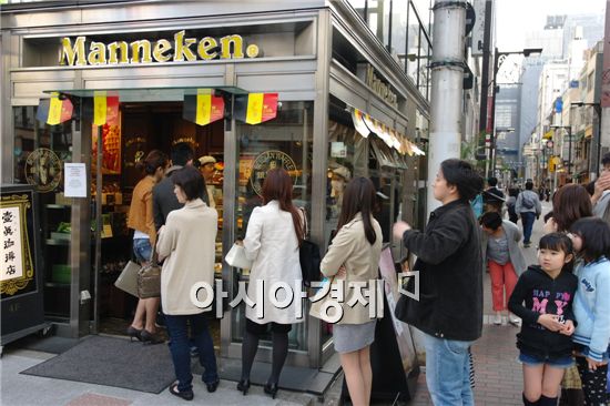 [도쿄(일본)=아시아경제 김진우 기자]휴일이었던 10일 오후 일본 도쿄 시내의 한 와플 가게 앞에 손님들이 줄을 서서 기다리고 있다.