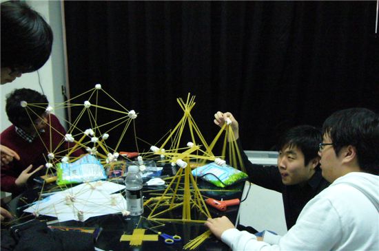 지난7일 부산의 과학영재학교에서 열린 '과학축전' 물리 콘테스트에서 3학년 지동진 학생(오른쪽에서 두번째)이 친구들과 함께 '파스타면과 마시멜로를 이용해 가장 높은 탑 쌓기'에 도전하고 있다.