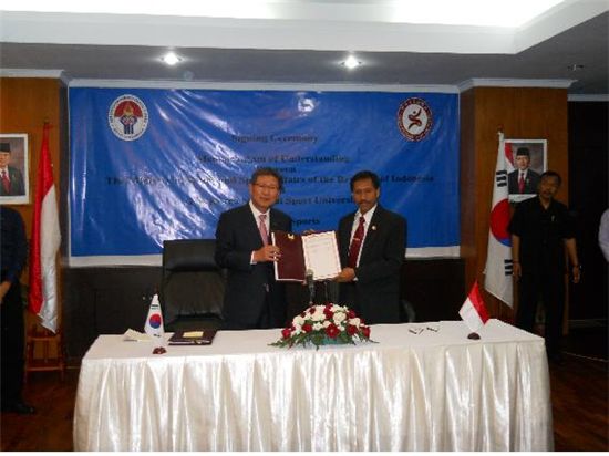 김종욱 한체대 총장은 지난 7일 자카르타의 인도네시아 청소년체육부 청사에서 인도네시아 청소년체육부 조꼬 쁘끽 이리얀토 차관과 양해각서 체결식을 갖고 스포츠교류를 통한 양국간 우호 협력 강화를 약속했다.