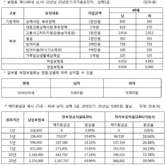 - 상기 예상해지환급률은 적립부분 순보험료(적립부분 영업보험료에서 회사운영경비를 차감한 금액)를 이 계약의 공시이율(2011.4월 현재 4.2%, 단 2년이내 해지시 중도해지이율 )로 적립산출한 것으로 향후 이 계약의 공시이율, 계약내용변경, 보험료 실납입일등에 의해 변동될수 있음, 단, 최저보증이율 : 연복리 2.0%- 위 예시된 해지환급금은 미래의 수익을 보장하지 않음.- 해지환급금은 납입한 금액보다 적거나 없을 수도 있음.- 교통사고처리지원금(동승자포함), 벌금, 방어비용, 방어비용(약식기소제외) 특약은 음주, 무면허, 도주시
