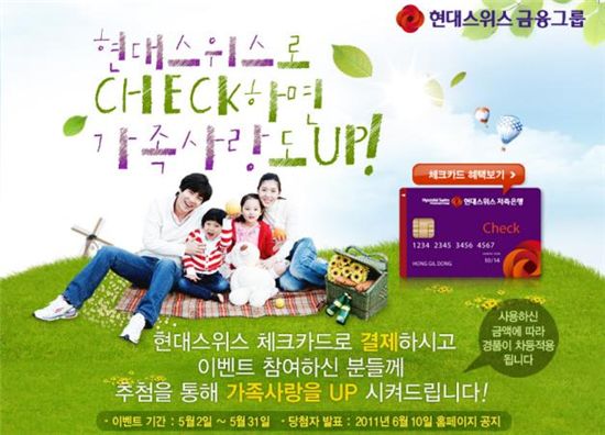 5월 한달간 '현대스위스 체크카드'로 2만원 이상 결제한 후 현대스위스저축은행 홈페이지(www.hsb.co.kr)에서 이벤트에 응모하면 추첨을 통해 결제한 금액에 따라 아이패드, 아웃백 식사권, SK주유권, CGV영화예매권, 스타벅스 카페라떼 기프티콘 등을 받을 수 있다.