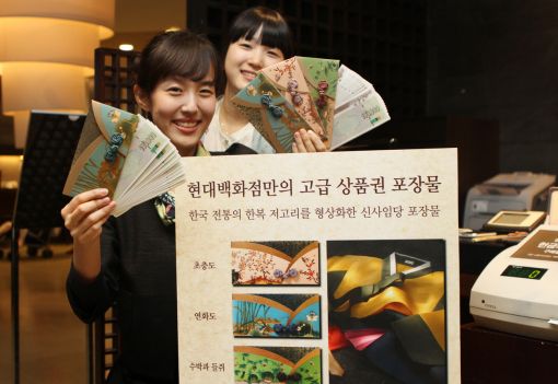 현대백화점 관계자는 "최근 김연아의 피겨 음악 '오마주 투 코리아'의 영향으로 전통 문화에 대한 관심이 늘고 있어 어버이날을 앞두고 기존 포장케이스 대신 전통미를 느낄 수 있는 소재로 봉투를 만들었다"며 "고객들의 반응도 예상밖으로 좋다"고 말했다.