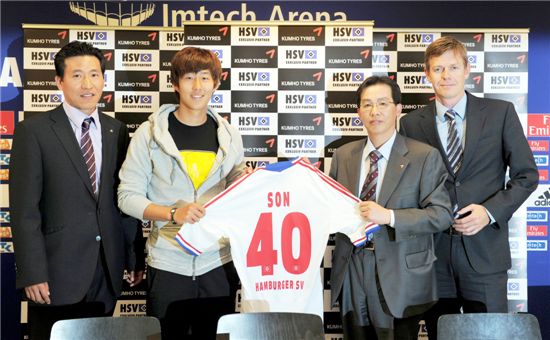 $pos="C";$title="";$txt="지난 12일 함부르크 홈구장에서 열린 금호타이어 스폰서십 계약 발표 직후 기념촬영을 하고 있다. 왼쪽부터 윤원일 금호타이어 유럽마케팅팀장, 손흥민 선수, 정창중 금호타이어 독일 법인장, 요아킴 힐케 함부르크SV 마케팅/커뮤니케이션 이사가 기념촬영을 하고 있다.