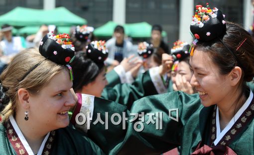 [아시아경제 이재문 기자]성년의 날인 16일 오후 서울 명륜동 성균관대학교에서 만20세를 맞이한 여학생들이 족두리를 쓰고 있다.
