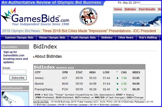 평창은 올림픽 전문 사이트인 게임즈비즈닷컴(GamesBids.com)이 최근 3개 후보도시의 경쟁력을 평가한 비드인덱스에서 지난 평가보다 1.30포인트 오른 66.29포인트를 기록해 1위를 굳게 지켰다.