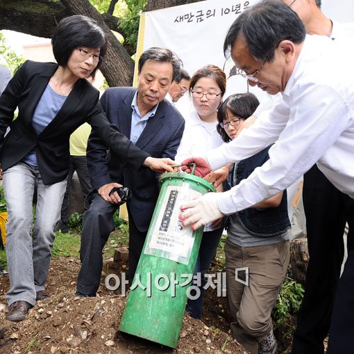 [아시아경제 윤동주 기자] 25일 오후 서울 종로구 환경운동연합에서 새만금 타임캡슐 10주년을 오픈 행사에 참가한 김종남 환경연합 총장등 참석자들이 타임캡슐을 개봉하고 있다.