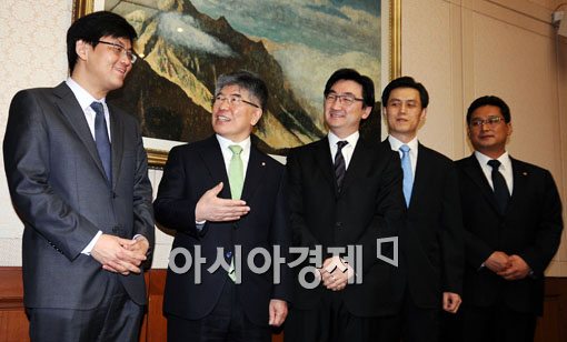 [아시아경제 윤동주 기자] 김중수 한국은행 총재가 31일 오전 서울 중구 남대문로 한국은행에서 투자은행 전문가와 최근 금융현안에 대해 의견을 나누고 있다.