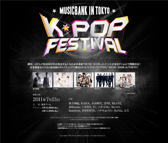 한류의 열풍이 거센 가운데 국내 여러 가수들이 일본에서 공연을 연다. 7월 13일 일본 도쿄돔에서 열리는 이 공연은 KBS 저팬이 <뮤직뱅크>와 협력해 마련한 행사로 동방신기, 소녀시대, 카라, 2PM, 비스트, 포미닛, 유키스, 아이유, 백지영, 시크릿, 레인보우, 인피니트, 박현빈, 라니아, X-5 등 현재 한류의 중심에 서 있거나, 일본 데뷔 준비 중인 가수들이 포함되어 있다.