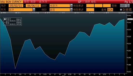 6일(현지시간) 뉴욕 선물시장에서 금 현물은 1개월 사이에 최고치로 올랐다. 금 현물가격은 이날 장중한때 전 거래일에 비해 0.8% 오른 1553.30달러까지 올랐다. 지난달 첫 째주 최저가 1462.40달러에 비해서는 6%나 오르기도 했다.