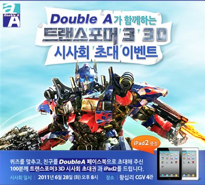 매일 10명씩 총 100명에게 트랜스포머3D 시사회 티켓을 한명당 2매씩 주며 이벤트에 참여한 사람 가운데 2명을 뽑아 아이패드2를 준다. 티켓당첨자는 매일 오전, 아이패드2 당첨자는 21일 발표된다. 한편 회사는 오는 29일 개봉하는 트랜스포머3와 파트너십 제휴를 맺고 마이클 베이 감독이 직접 더블에이 TV광고를 제작하는 등 다양한 마케팅을 준비중이다.