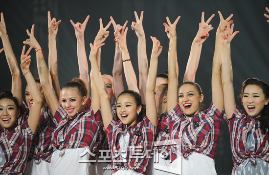 [안암=스포츠투데이 정재훈 기자]12일 오후 고려대 화정체육관 특설무대에서 열린 'LG 휘센 리드믹 올 스타즈 2011'에서 공연을 마친 선수들이 인사를 하고 있다.