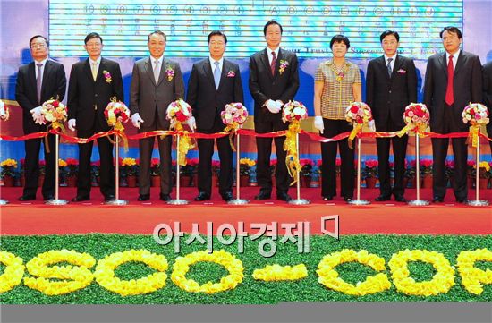 준공식에서 테잎 커팅에 앞서 참석자들이 기념촬영을 하고 있다. 사진 왼쪽부터 정길수 POSCO-China 총경리, 조백상 선양(瀋陽) 총영사, 강덕수 STX그룹 회장, 정준양 포스코 회장, 샤더런(夏德仁) 다롄(大連)시 서기, 왕핑(王萍) 다롄시 부비서장, 진청(金程) 창싱다오(長興島) 경제기술개발구 주임, 우성푸(吳生富) 중국일중중장비그룹 동사장.