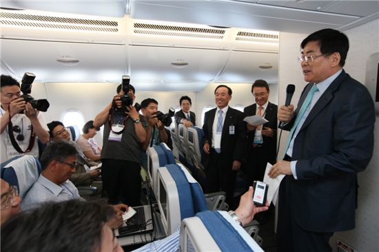 오전 11시가 넘자 A380은 거대한 몸을 이끌고 움직이기 시작했다. 묵직했다. 그러면서도 조용했다. 이륙할 때는 물론 상공에서 A380은 진가를 발휘했다. 안락했고 소음이 거의 없어 편안했기 때문이다. 조양호 한진그룹 회장은 "굉장히 조용한 비행기"라면서 "고객의 안락함과 친환경 기재 도입, 경제성 등 3가지를 최우선 순위에 놓고 준비했다"고 설명했다.