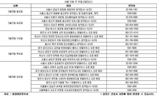 20일 부동산정보업계에 따르면 6월 넷째 주에는 전국 10곳에서 3340가구가 청약접수를 받는다. 이중 오피스텔이 1414실, 도시형생활주택이 99가구, 임대가 50가구다. 서울 송파와 용산 등에서 오피스텔이 청약접수를 시작하며 전국 곳곳에서 모델하우스가 문을 열 예정에 있다.
