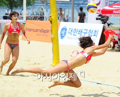 [아시아경제 윤동주 기자] 17일 서울 잠실한강공원 특설경기장에서 열리고 있는 '2011 Crown 해태 FIVB 세계여자비치발리볼 서울 챌린저대회'에서 참가 선수들이 뜨거운 태양아래에서 예선경기를 하고 있다.