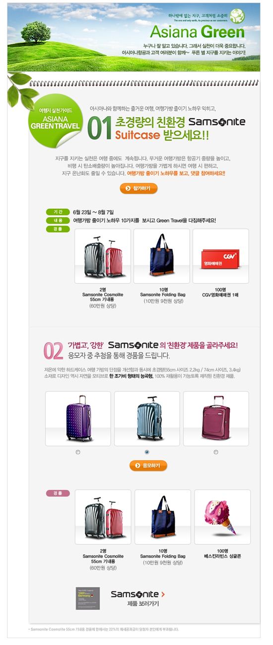 퀴즈 이벤트는 아시아나항공 홈페이지(flyasiana.com)에서 친환경을 생각한 쌤소나이트의 초경량 고강도 제품을 선택하여 참여할 수 있다. 쌤소나이트는 퀴즈 이벤트 참가자 중 추첨을 통해 2명에게 쌤소나이트의 초경량 고강도 여행가방인 코즈모라이트 55cm 기내용, 10명에게 쌤소나이트 폴딩백, 그리고 100명에게 배스킨라빈스 기프티콘을 제공할 예정이다.