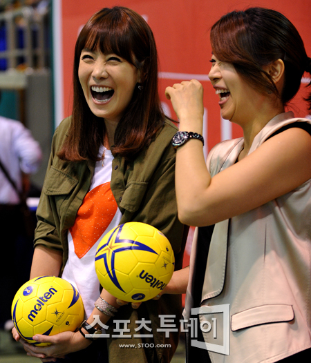 [광명=스포츠투데이 정재훈 기자] 7일 오후 경기도 광명체육관에서 열린 'SK핸드볼 코리아 리그 여자부' 용인시청과 삼척시청의 플레이오프 경기에서 영화 '우생순'의 주인공 김정은과 김지영이 경기에 앞서 시구를 준비하고 있다.