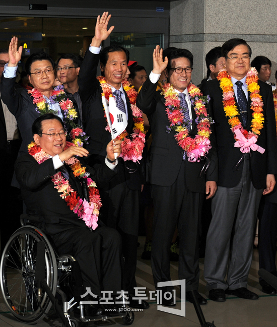 [인천=스포츠투데이 정재훈 기자] 2018년 동계올림픽 유치에 성공한 평창 동계올림픽 유치단이 8일 오후 인천국제공항을 통해 귀국했다. (좌측 위부터 시계방향으로) 김진선 특임대사, 최문순 강원 도지사, 정병국 문화체육관광부 장관, 조양호 평창유치위원장, 윤석용 대한장애인체육회회장이 손을 흔들고 있다.