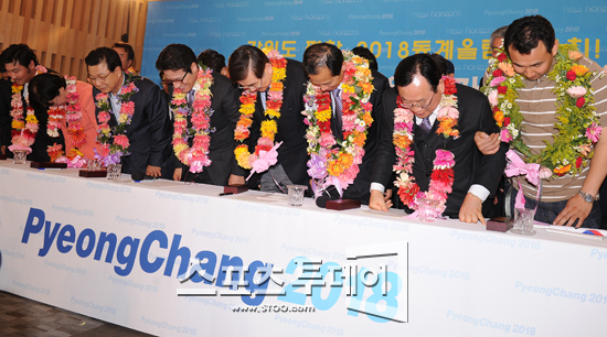 [인천=스포츠투데이 정재훈 기자] 2018년 동계올림픽 유치에 성공한 평창 동계올림픽 유치단이 8일 오후 인천국제공항을 통해 귀국했다. 유치단이 기자회견에서 국민들을 향해 고개 숙여 인사하고 있다.