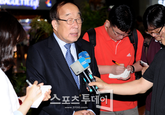 [인천=스포츠투데이 정재훈 기자] 박용성 대한체육회 회장이 평창 동계올림픽 유치 활동을 마치고 10일 오후 귀국해 취재진과 인터뷰하고 있다.