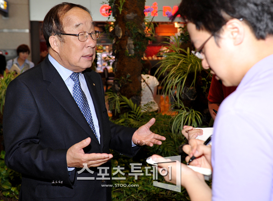 [인천=스포츠투데이 정재훈 기자] 박용성 대한체육회 회장이 평창 동계올림픽 유치 활동을 마치고 10일 오후 귀국해 취재진과 인터뷰하고 있다.
