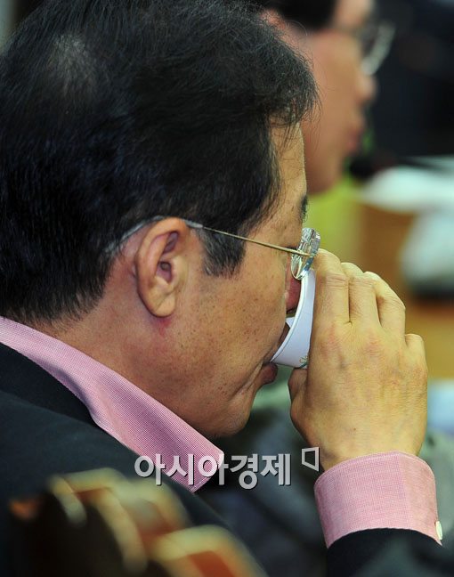[아시아경제 윤동주 기자] 13일 오전 서울 여의도 한나라당사에서 열린 최고중진연석회의에 참석한 홍준표 대표가 갈증이 나는 듯 물을 마시고 있다.