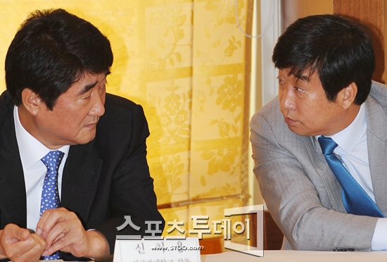 [스포츠투데이 정재훈 기자] 18일 오전 서울 프레스센터 외신기자클럽에서 'Again 배구 슈퍼리그! 한양대 vs 성균관대' 조인식이 열렸다. 신치용 성균관대 OB팀 감독(왼쪽)과 김호철 한양대 OB팀 감독(오른쪽)이 기자회견 도중 대화를 나누고 있다.