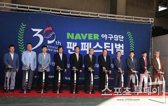 [잠실=스포츠투데이 정재훈 기자] 20일 오후 잠실 올림픽주경기장에서 '프로야구 30주년 팬 페스티벌 개막식'이 열렸다. 개막식에 참석한 VIP들이 버튼을 눌러 개막을 알리고 있다.