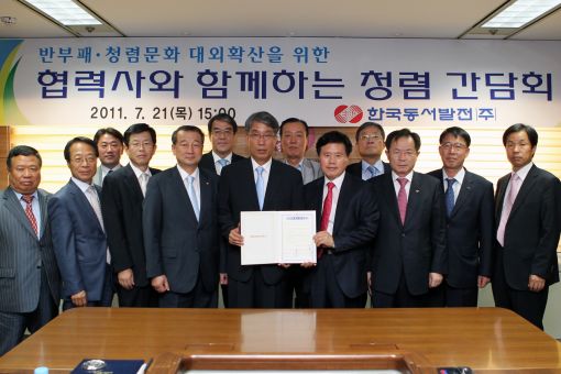 [아시아경제 이경호 기자]한국동서발전(사장 이길구)은 21일 서울 삼성동 본사 대회의실에서 경상정비 협력회사 및 당진화력 9, 10호기 건설회사와 반부패·청렴문화 확산을 위한 청렴실천협약을 체결했다고 밝혔다.