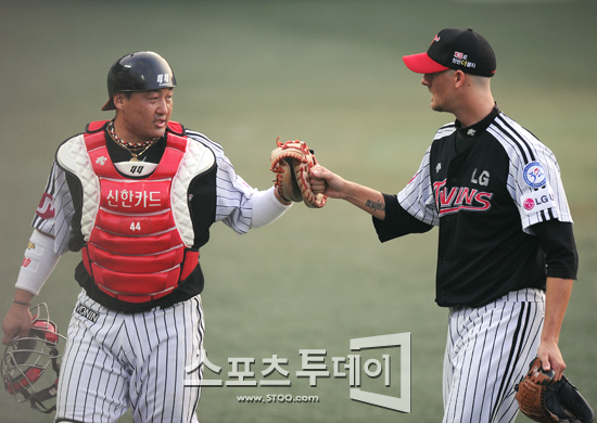 [목동=스포츠투데이 정재훈 기자] 21일 오후 목동 야구장에서 열린 '2011 롯데카드 프로야구' 넥센 히어로즈와 LG 트윈스의 경기에서 조인성이 수비를 마치고 나.