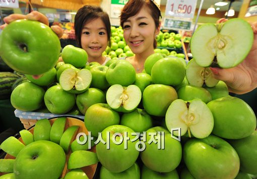 [아시아경제 윤동주 기자] 롯데마트는 25일 서울 봉래동 서울역점에서 사과 중 가장 먼저 출하되며 가을의 전령이라고도 불리는 경북 안동산 아오리 사과를 선보이고 있다.